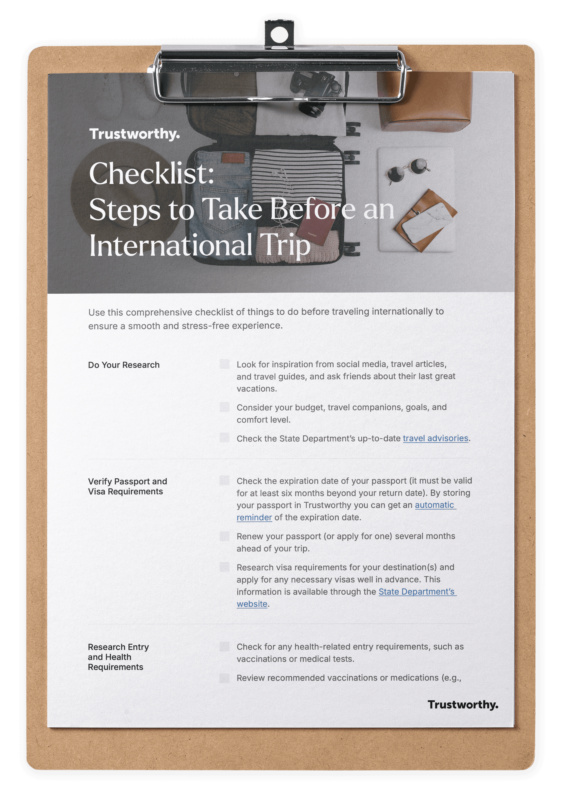 Check the expiration date of your passport (it must be valid for at least six months beyond your return date). By storing your passport in Trustworthy you can get an automatic reminder of the expiration date.